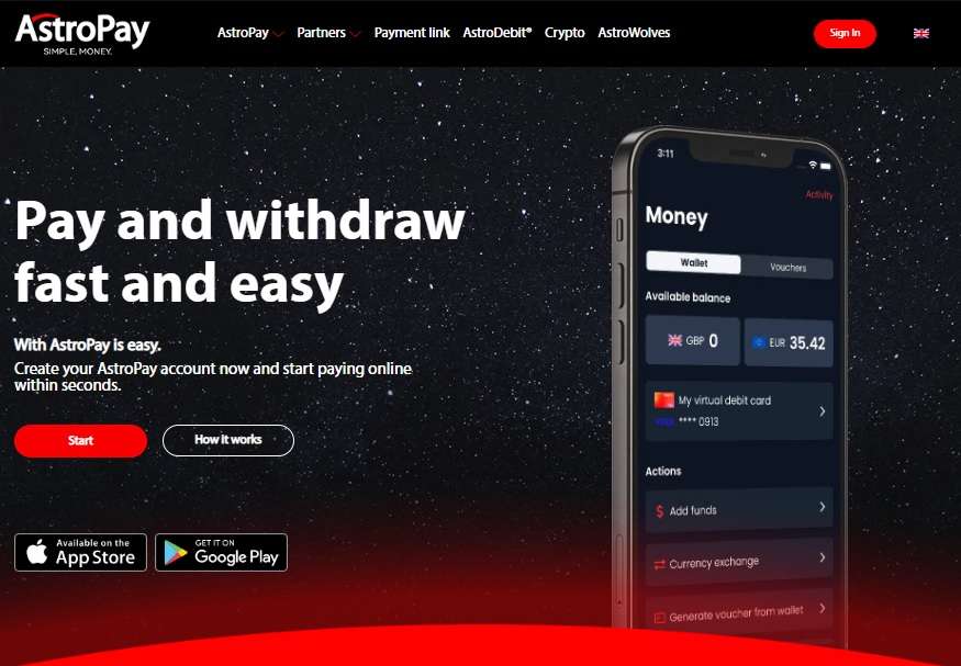With the help of AstroPay, consumers can swiftly and safely transact in local currencies or US dollars and will be able to make deposits and withdrawals from their preferred online sites using their local payment methods. From a single AstroPay account, you can manage several different credit cards, including AstroPay Card, Google Pay, Visa, and MasterCard.