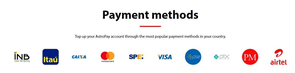 There are a lot of payment methods available in AstroPay which varies with your country of residence. The most common payment options are VISA, MasterCard, Trustly, Google Pay, Caixa, Itaú, Boleto, Phone Pe, UPI, Bank Transfer etc.