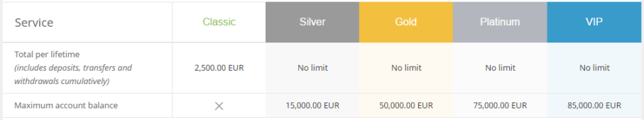 - The maximum value of balance that a Silver status account can hold totals to €15 000.