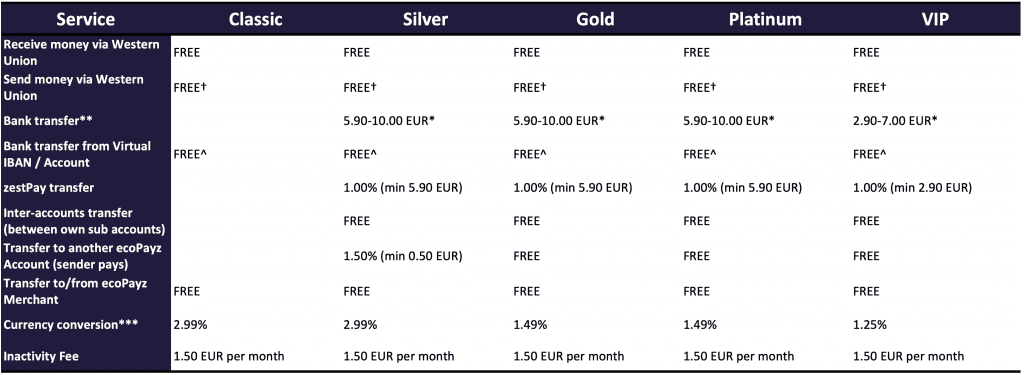 ecoPayz Master Cards operate on a unique principle that sets its tariffs regardless of your account status. Read more about the fees on the ecoPayz MasterCard on the official ecoPayz website.