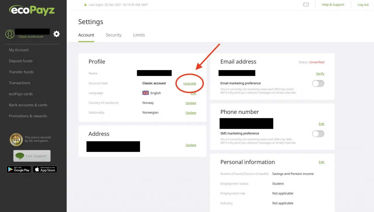 - 1. Log onto the official ecoPayz website and after logging in to your account, click on “Upgrade.”