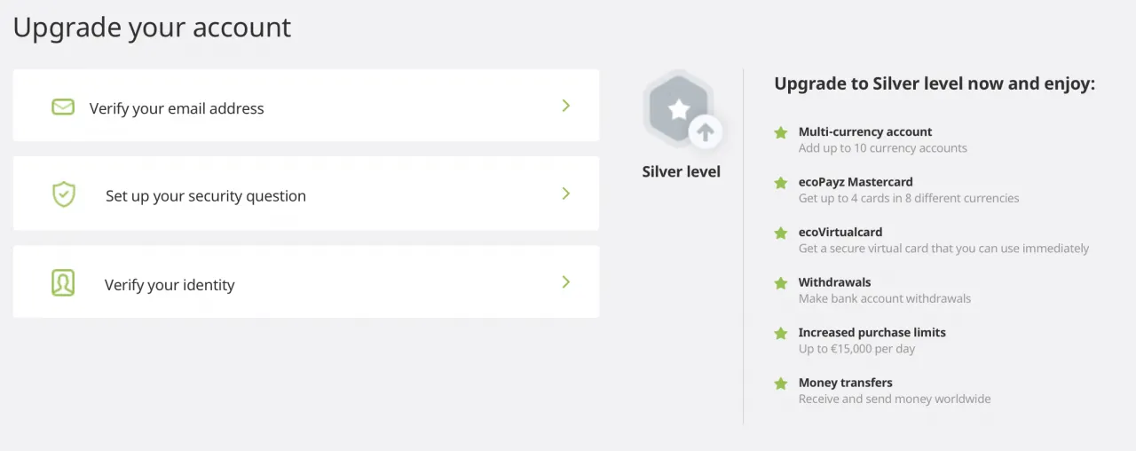 Users may substantially optimize their ecoPayz account and gain additional benefits by combining it with the eWalletsReview exclusive VIP deal. All they have to do is register an account on ecoPayz’s official website by following this link and follow a few easy steps. Next, they need to finish the account verification process that involves users providing proof of their identity through identity cards, passports, or driving licenses and their residency verification through utility bills, residency certificates, or bank statements. The account will then be upgraded to ecoPayz Gold immediately after verification, with lower costs and higher limits.