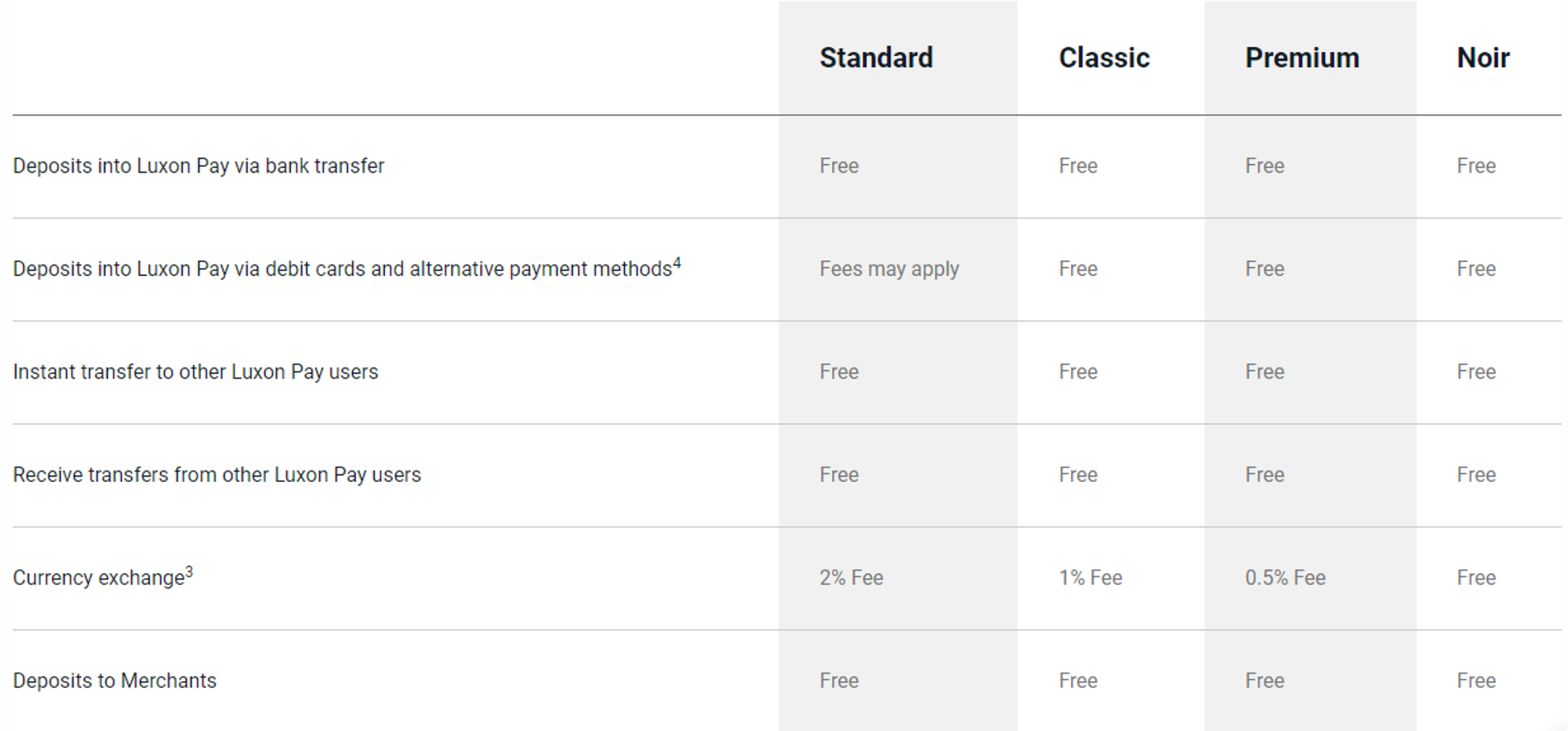 Deposit FeesUsers must deposit money into their wallets before they can begin utilizing their e-wallet. Depositing money through various mediums is subjected to some fees on most of the digital wallets except Luxon Pay. There is no fee charged for depositing your Luxon wallet through bank transfer, debit cards, or other payment methods. Also, depositing to merchants are also free at any level of the account. Moreover, sending and receiving instant funds between Luxon Pay users is also free of charge.