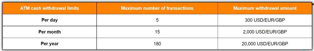 Other restrictions include a maximum of 5 ATM transactions each day and a maximum of 300 units of your account’s currency. You can make 15 ATM transactions for a total of 2000 currency units throughout 30 days.